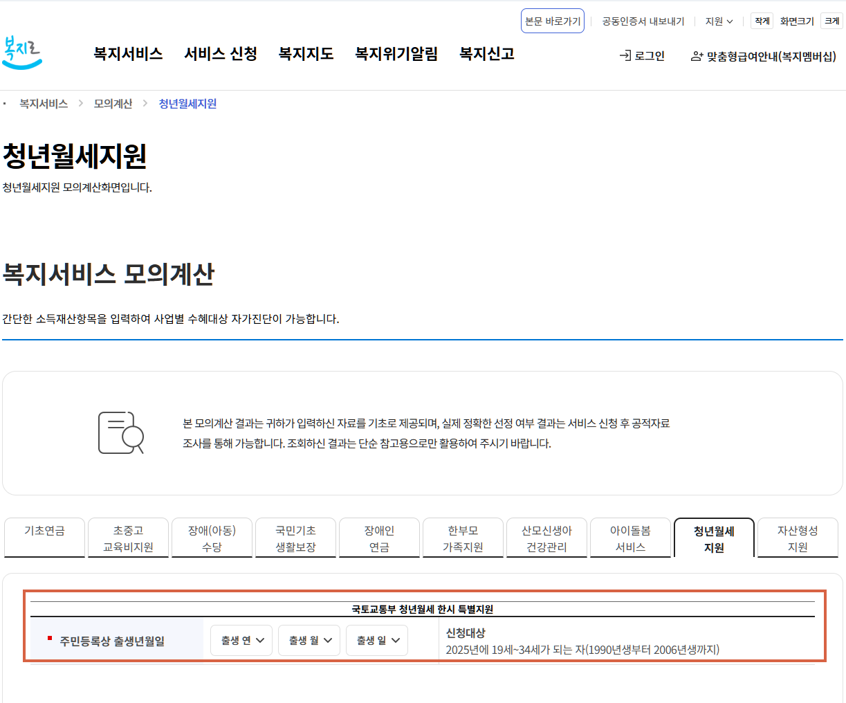 - “복지서비스 모의계산” 메뉴 선택